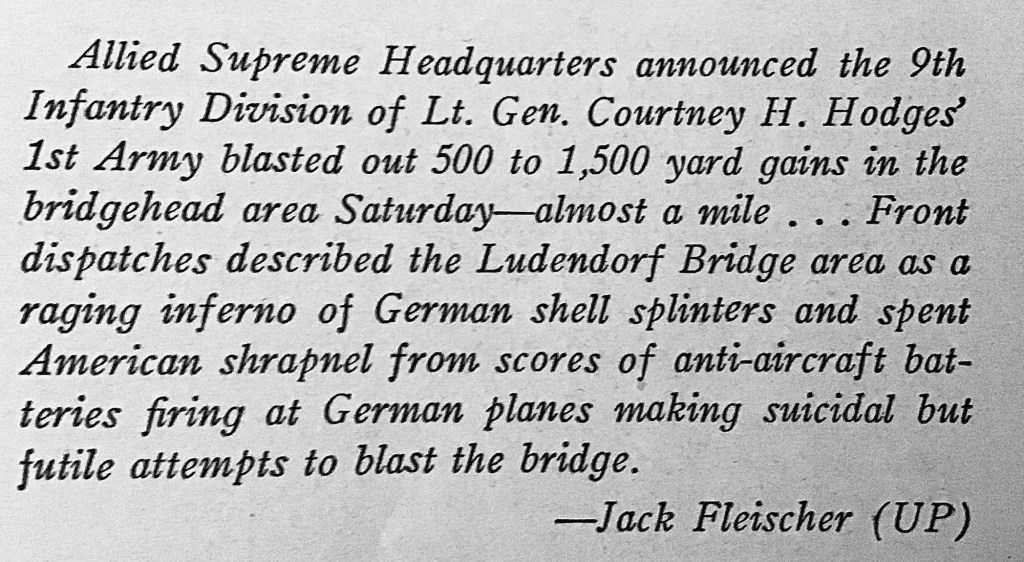 The Battle of the Bulge, The Ardennes, the fight across Germany to the Rhine River – Noble saw all of that. On 7 March, when the American 9th Armored Division captured the bridge across the Rhine River at Remagen, Noble and the 60th RCT were among the first Infantry units to cross under heavy fire and defend the bridgehead from the East side of the Rhine.