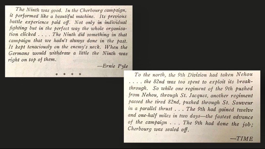 - I relied on the book, “Eight Stars to Victory, A History of the Veteran Ninth U.S. Infantry Division”, published in 1948, as background for much of the factual information in this blog.