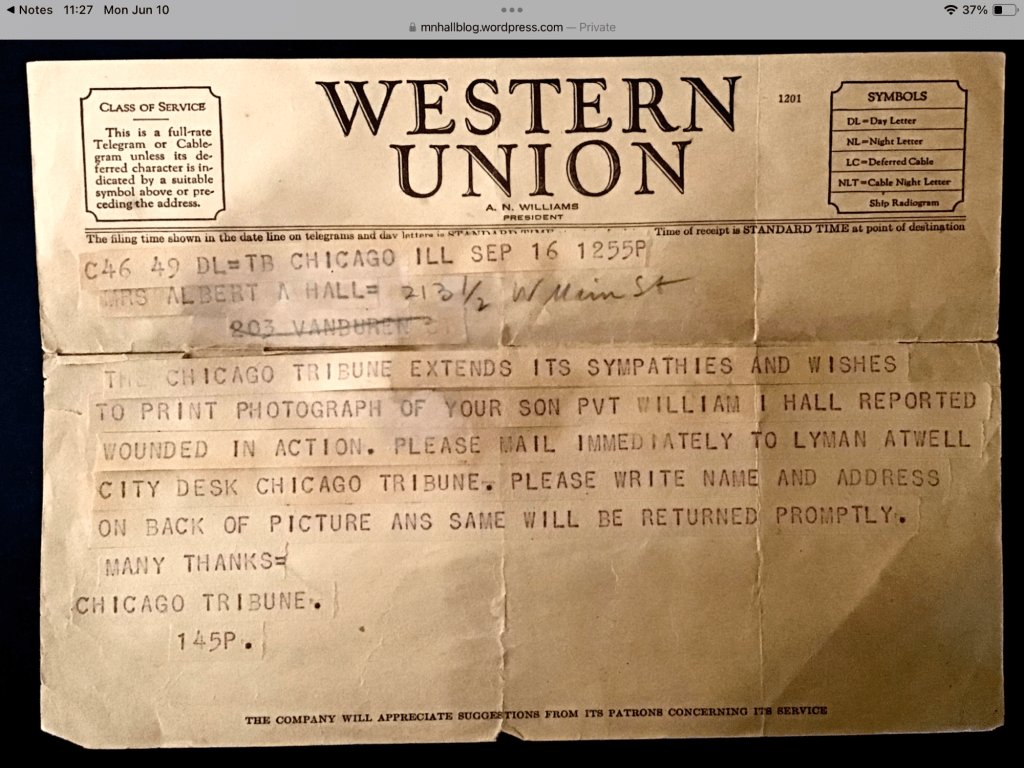 It turned out Noble and Myra were traveling from a vacation in Wisconsin back to Southern Illinois where they lived, when they passed our hometown – Ottawa. Noble thought Dad had died in Sicily, and then remembering he was from Ottawa, decided to stop in and see if he could find Dad’s parents and offer his condolences. He looked the name William Hall up in the phone book, and stopped off at the local VFW to see if anyone knew of Dad or his relations. They then drove to the address from the phone book, assuming it was my grandfather’s home. Instead, he and Dad saw each other for the first time since August of 1943 in Sicily.