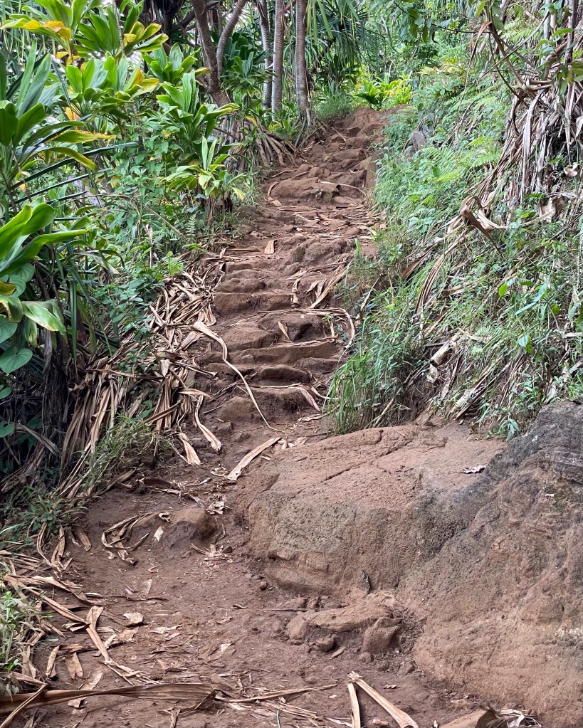We started up the trail about 9:15. The first section was two plus miles from Ke’e Beach to Hanakapi’ai Beach. Two miles – easy peasy, right? Well, not quite. The first mile was all uphill, much of it over slick flat rocks. The trail also had a 500 or so foot drop off on the right hand side, which ended in the ocean. Mental note to self:if you fall on the rocks, don’t fall to the right. As we hiked along, we passed some folk, others passed us. One young woman hiked by in flip flops, while chatting with her friends. We eventually reached the high point and were rewarded with beautiful views of the ocean and distant coastline. We stopped and took a couple of pics, before continuing.