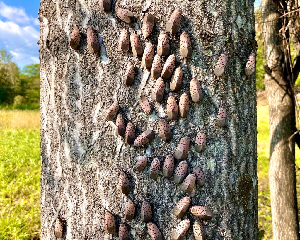 Spotted Lanterflies Feasting on a Tree of Heaven Trunk.