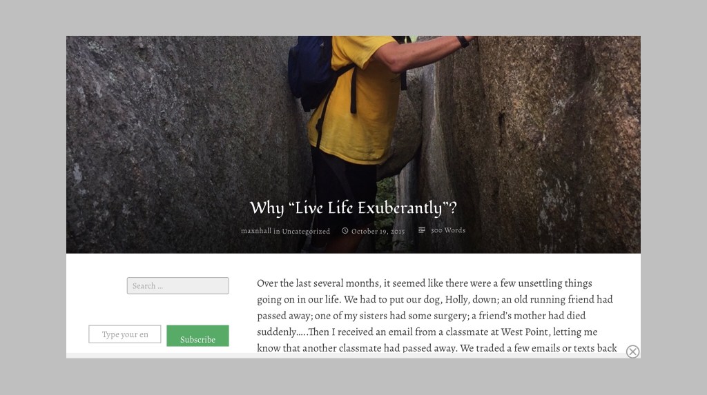 My first blog, “Why Live Life Exuberantly”, (a link is in the addendum) was published on October 19th, 2015. It was 300 words long and a reaction to a number of health issues or deaths several friends and family members were going through at the time. Looking back now, I think it was an attempt to start something new in life, partly to show myself I was still alive, and maybe growing.