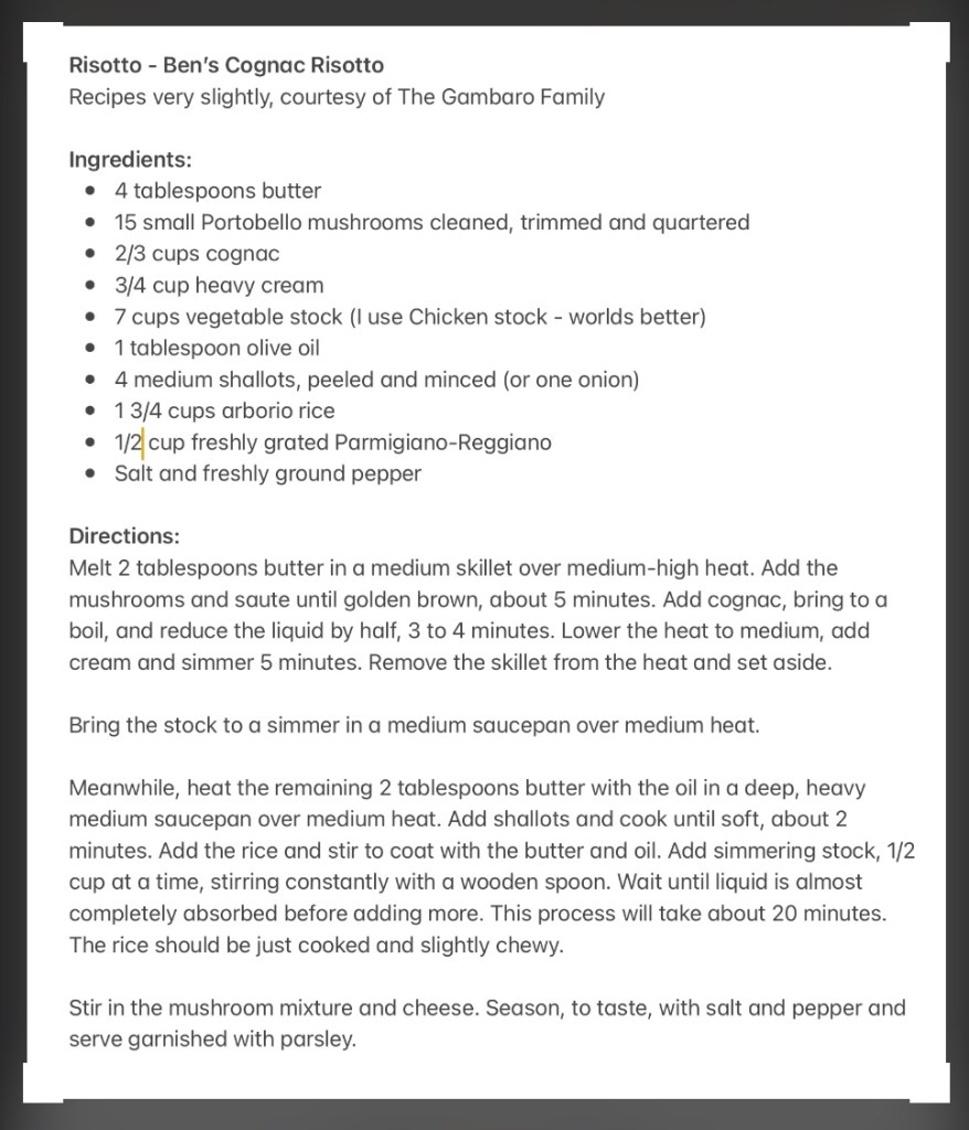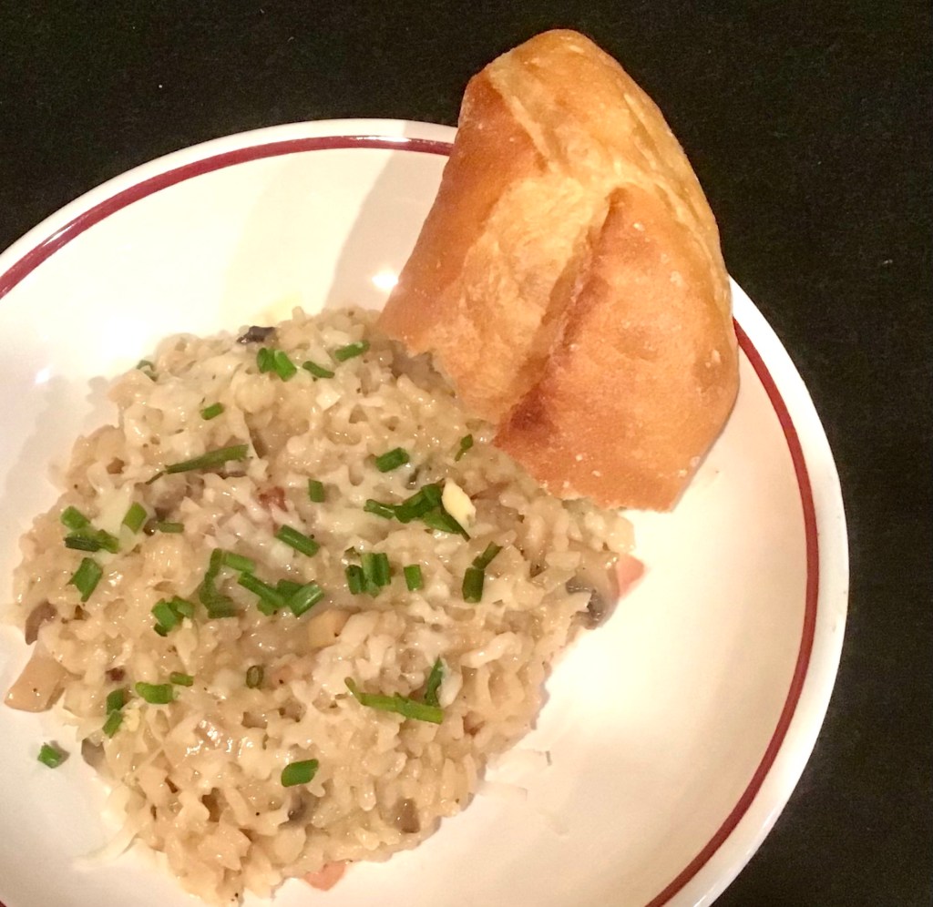 Last Thursday I had a series of follow-up fasting blood tests. I wouldn’t receive the results for a day or two, but decided to celebrate early and chose to make risotto for dinner that night. On the way home, I picked up some cream for the sauce, along with fresh bread from a local bakery. I mean what the hell, in for a penny, in for a pound. While I have several risotto recipes, there was no doubt in my mind about which one I would make – Ben’s Cognac Risotto – a favorite of ours, with mushrooms, shallots, cream, butter, and plenty of Parmesan cheese.