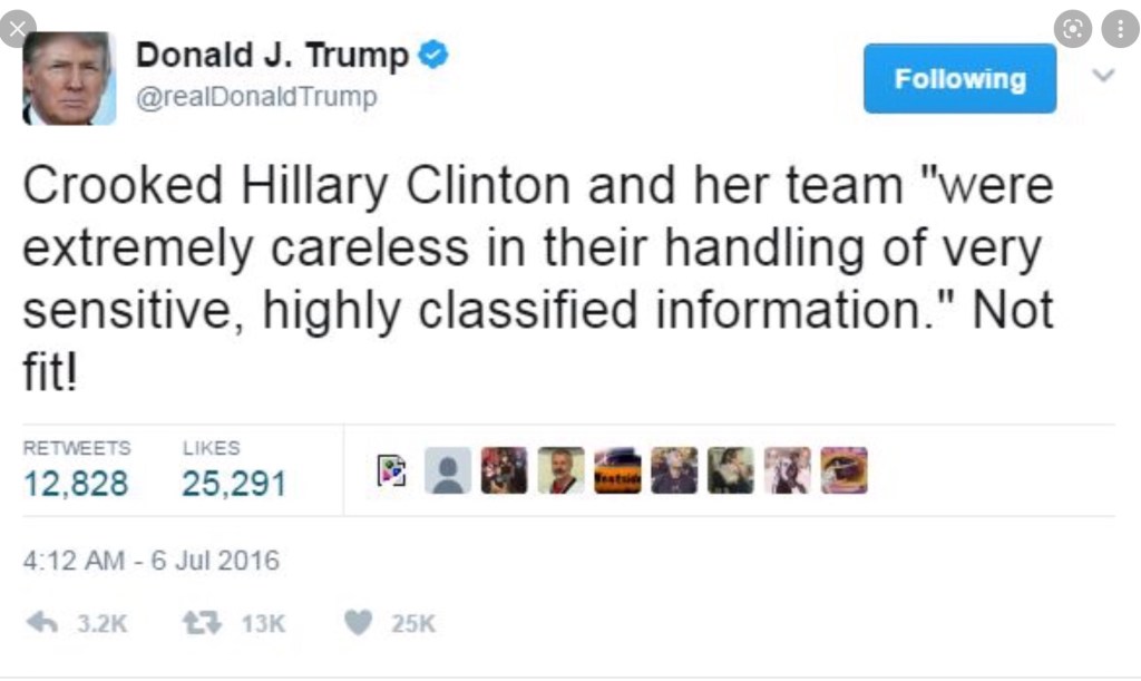 - When Hilary Clinton was investigated for her server, people were calling for her prosecution and spoke of how she was unfit for office. Many of those same people are now saying what the former President has done is no big deal, and he can do what he wants.