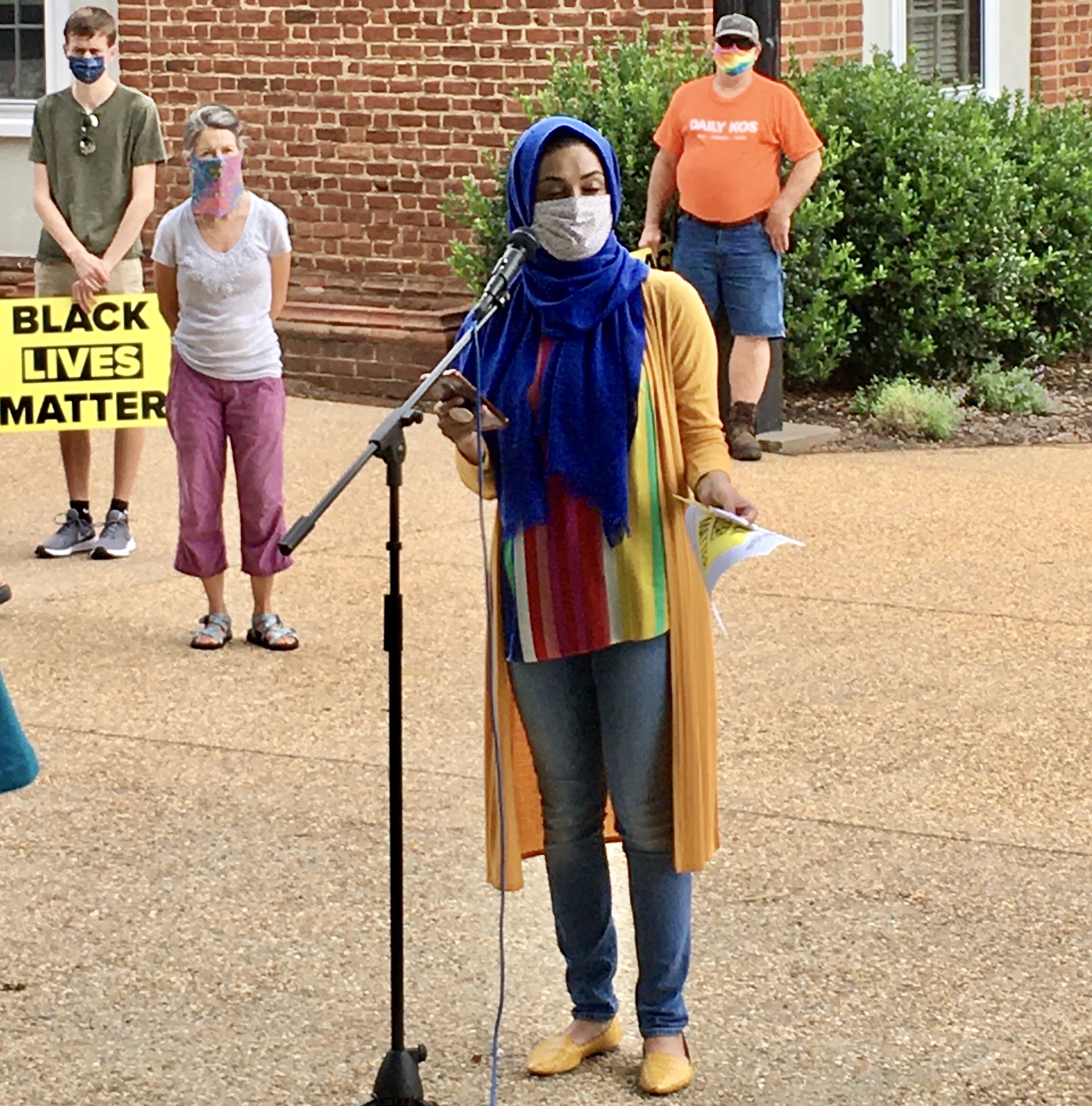 We were greeted by Atefeh Rokhvand, who then introduced Imam Nahidian from the Manassas, Virginia Mosque. After his thoughtful and encouraging words, we moved to the streets approaching the courthouse, where we stood waving our signs. Many who drove by honked and gave a thumbs up. Some just looked straight ahead. And two (that I saw) flipped us off. Interestingly, of the two flipping us off, one drove a black pickup truck and the other a black Dodge Charger. Evidently, they thought black vehicles mattered, but their views apparently didn’t extend to black lives mattering.