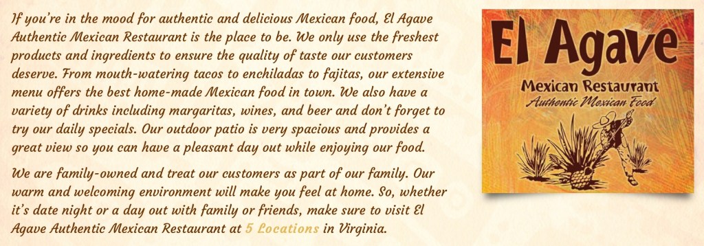 There are five local El Agave restaurants in or near Fauquier County, Virginia. I’ve only been to two of them – the one in Warrenton, and one half way between Marshall and The Plains. I highly recommend both of them. You can learn more about El Agave here: https://elagavemexrestaurant.com/